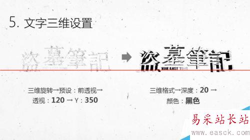 5、文字三維設(shè)置。文字三維旋轉(zhuǎn)預設(shè)設(shè)置為前透視→透視為120°→三維深度設(shè)置為20→深度顏色設(shè)置為黑色。