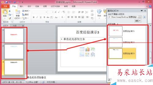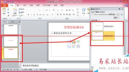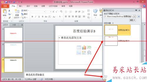 6、同樣的方法,點擊“重用幻燈片”,打開“百度經驗2”,選擇“保留原格式”,雙擊即可出現