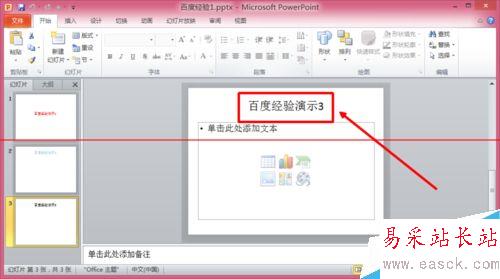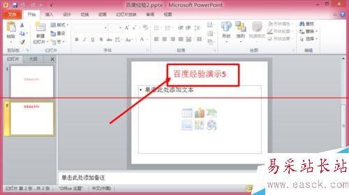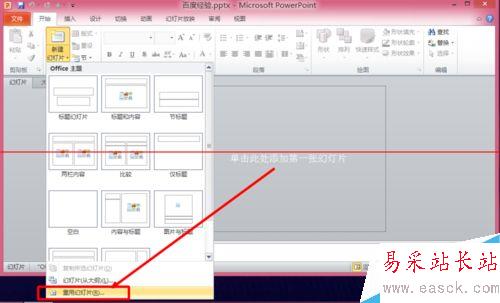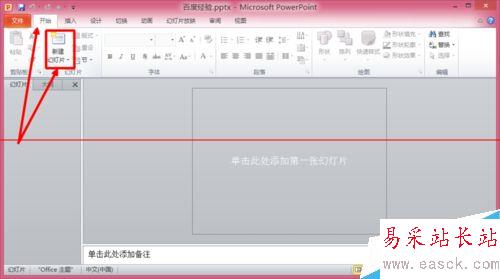 3、打開新建的“百度經驗.pptx”,我們點擊“開始”,選擇“新建幻燈片”下的三角圖標