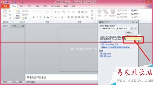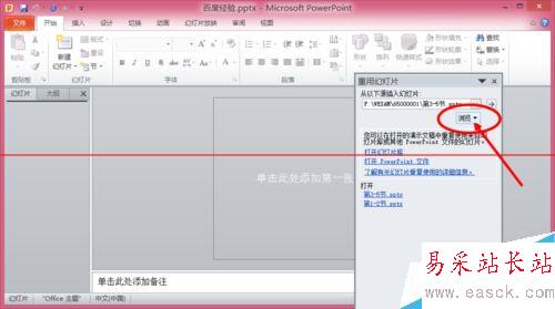 4、點擊“重用幻燈片”,點擊“游覽”,選擇“游覽文件”