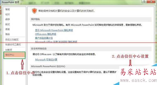 5、進入彈出的“選項”窗口,依次選擇“信任中心”——“信任中心設置”進入下一個界面
