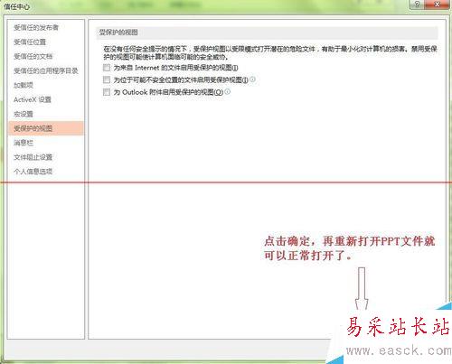 6、選擇“受保護視圖”,將右邊窗口三個選項全部取消 “√”選,點擊“確定”,