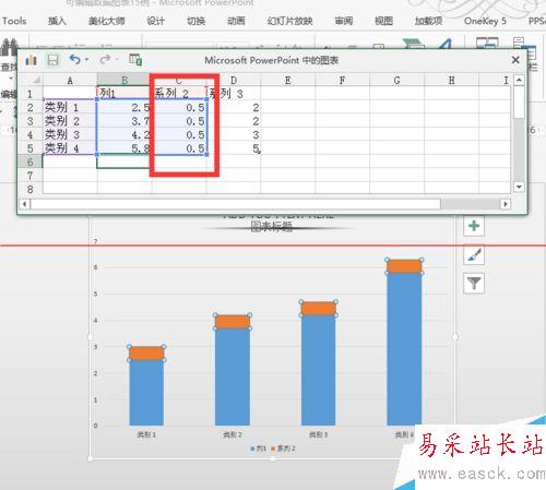 4、我們用系列1來顯示數據的大小,用系列2來制作長條,所以,我們先要編輯數據,使長條的數據變成一樣的大小。右鍵,編輯數據,就打開一個excel表格,將系列2的值改為統一數值0.3,這樣長條就被壓扁。