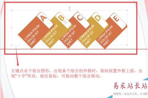 2、左鍵點擊下組合圖形,出現真個組合的外框時,鼠標放置外框上面,出現“十字”形狀,按住鼠標,可拖動整個組合移動。