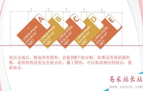 1、插入圖形后,發現A,B,C,D,E五項有很多圖形合并而成,我們需要的是將A,B,C,D,E分別組合。