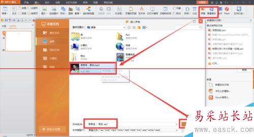 2、然后我們用wps將這個聲音文件添加到ppt中,添加完成就ok了,你是要加背景音樂還是聲音,這個按照您自己的需求即可!