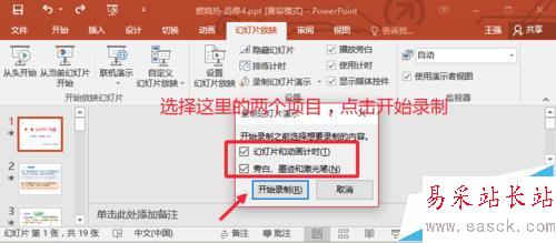 3、錄制幻燈片演示窗口中,我們選擇這里的兩個項目,然后點擊開始錄制。