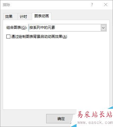 在打開的效果選項窗口中,可以設(shè)置伴隨動畫播放的音響效果,切換到“計時”選項卡中,可以設(shè)置每個柱形條的動態(tài)時長,最關(guān)鍵的是切換到“圖表動畫”選項卡中,將“通過繪制圖表背景啟動動畫效果”項取消勾選,然后點擊“確定”。