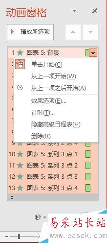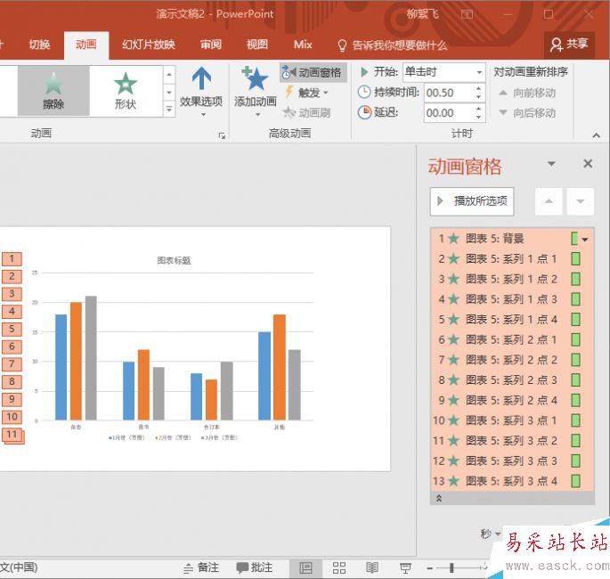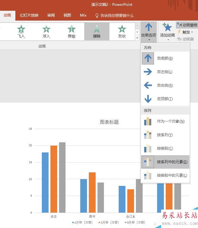 在PowerPoint中,點選粘貼過來的圖表,然后切換到“動畫”選項卡,選中“擦除”項,再點擊“效果選項”,從下拉菜單中選擇“按系列中的元素”,就會即時看到柱狀圖一條一條往上“漲”的動態(tài)效果了。