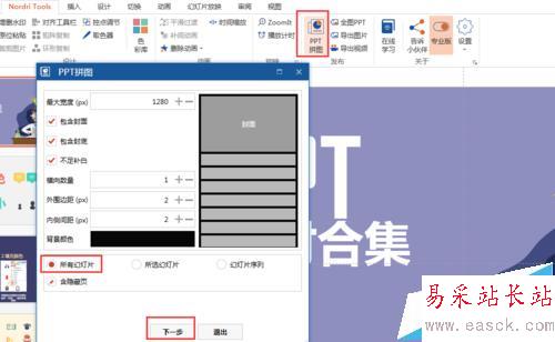 2、安裝好插件后重啟PPT,會發現在菜單欄中出現了這個插件,點擊它,會看到有一個PPT拼圖的選項,選中它,按照步驟操作即可將所有PPT導出成為一張圖。