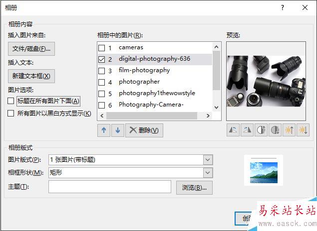 此時在中間列表中選中某張照片,可以通過上下箭頭銨扭調整圖它在整個幻燈片中的位置,或者也可以刪除不合適的照片,以及添加新的照片等。下方還可以設置圖片的版式,比如讓照片滿屏顯示,或者照片帶標題等。相框的形狀也可以有多種選擇。