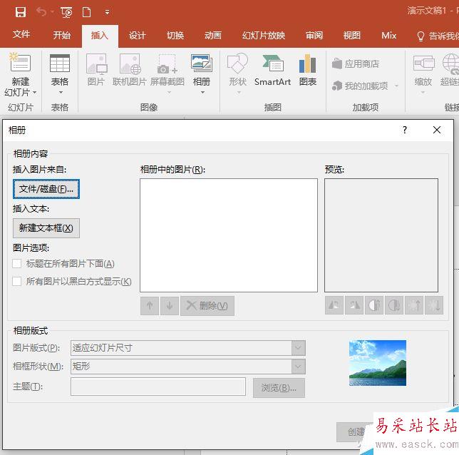 啟動PowerPoint 2016,切換到“插入”選項卡,點擊“相冊→新建相冊”,打開相冊對話框。