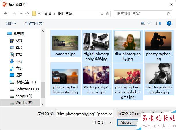 點擊相冊對話框中的“文件/磁盤”按鈕,打開瀏覽對話框,進入上面所保存圖片的文件夾中,全選其中的圖片后,點擊“插入”按鈕,返回到相冊窗口中。