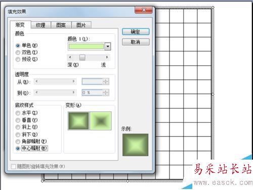 3、接著切換到填充選項卡,勾選填充顏色,點擊下拉菜單選擇填充效果彈出填充效果對話框,在該對話框中勾選單色和中心輻射,依次點擊確定按鈕。