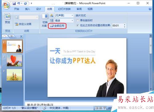 6、如果你覺得每張幻燈片都要一一設置比較麻煩。你還可以點擊“全部應用”。那么每張幻燈片都會停留相同的時間。換句話說,幻燈片是勻速前進的。