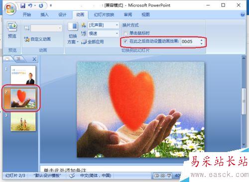 3、現在設置第二張幻燈片的時間。先單擊第二張幻燈片,然后勾選“在此之后自動設置動畫效果”,再設定時間。