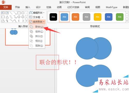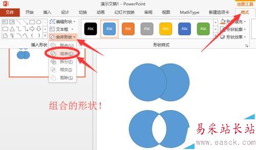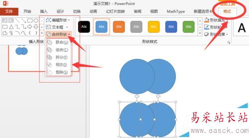 5、選中兩個(gè)形狀-會(huì)出現(xiàn)一個(gè)【繪圖工具】,選中【格式】打開(kāi),找到【合并形狀】-打開(kāi)發(fā)現(xiàn)相關(guān)內(nèi)容,如下圖所示: