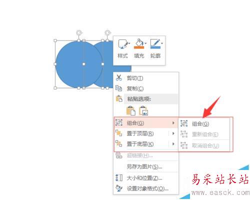 3、按住【ctrl】選中兩個(gè)圖形,單擊鼠標(biāo)右鍵,便可以找到組合。快快來(lái)操作吧。