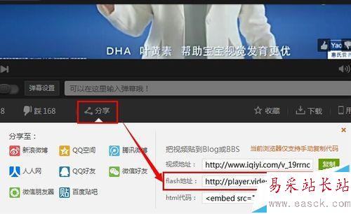 5、我們再在網絡上找到視頻文件,點擊分享按鈕,復制它的Flash地址,這個格式才能夠播放