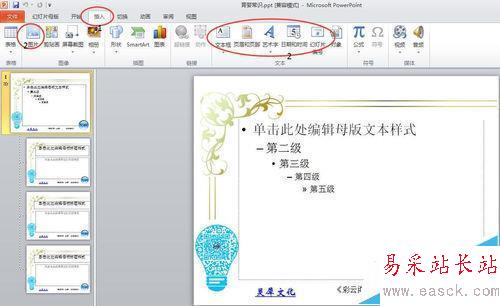 5、對母版進行插入圖片或者藝術字,文本框以及固定頁眉頁腳的操作。本圖中有兩個2,這個是說這兩處的操作不分先后,是獨立的!下面以插入圖片為例,進行講解。