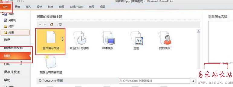3、新建空白幻燈片文檔,新手注意看圖,我標注的數字代表了新建空白文檔的順序哦。