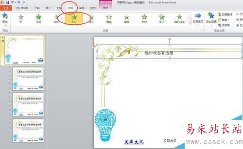 9、動畫預設完成之后按F5或者右下角的播放按鈕,就能看到動畫效果了。然后退出母版,進行幻燈片的正式編輯!