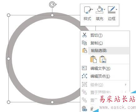 現在我們切換到“插入”標簽,點擊“形狀”,選擇“橢圓”,然后按Shift鍵不放,拖動鼠標繪制一個正圓形。然后右擊這個圓形,從右鍵菜單中操作,將它的填充色設置為“無填充色”,邊框色設置為灰色,并將邊框的寬度設置為24磅左右,一個環形就出來了。
