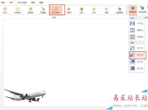 5、點擊“動畫”-“添加效果”-“強調效果”-“放大縮小”,然后點擊“效果選項”,選擇“較小”。現在就算設置好了,再預覽下試試