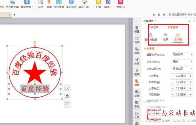 6、這里要說一下的就是,第五步完成后,還不是真正的合成,因為此時我們縮小標志時底部的文字不會縮小,所以我們還要設置一下,雙擊底部文字框,在右側菜單中依次選擇:文本選項—文本框——勾選:溢出時縮排文字。好了大功告成了!