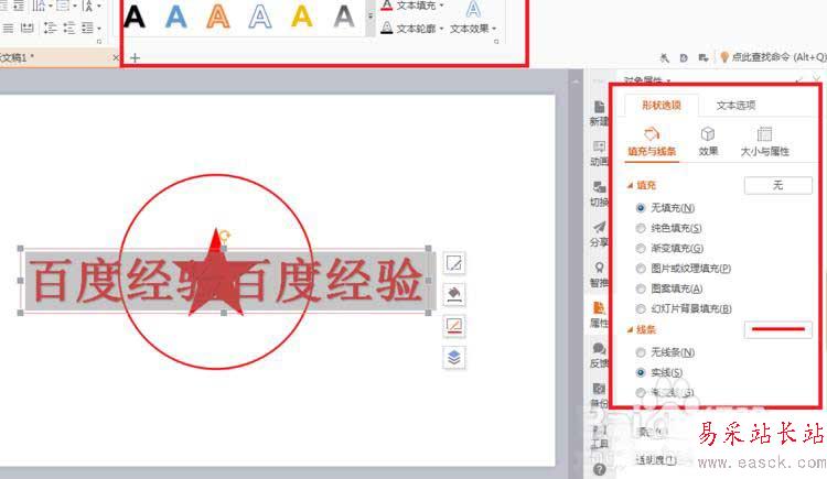 4、然后我們,在選擇插入藝術字,選擇底部的文字顯示,依舊是設置成紅色,這次不需要文字效果的設計,然后根據我們放大后的圓圈設置文字的大小。