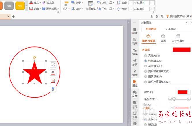2、然后我們再去插入一個五角星,這次不要取消填充色,我們將填充色和邊框改成紅色,當然必須和外面的圓圈同一種紅色,然后我們拖動適當放大后放入圓圈中間。