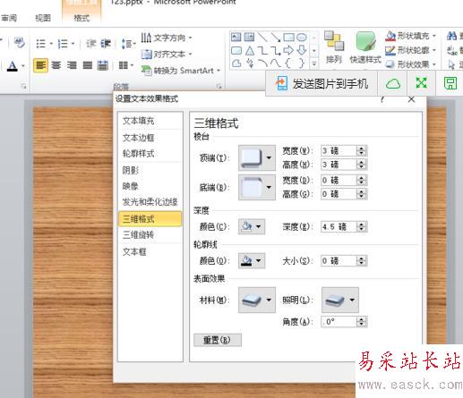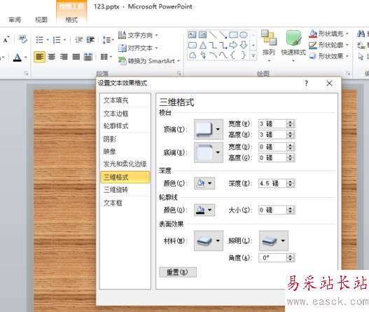 6、最重要的一步,設(shè)置文字效果格式——三維格式——頂部棱臺(tái),選擇第一個(gè)“圓”,修改寬度和高度的值,立體浮雕就出來了