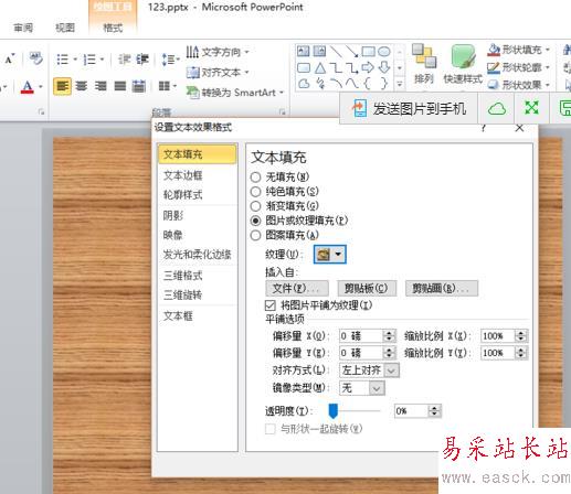 5、點(diǎn)擊文本填充,圖片或紋理填充,選擇與背景相同的紋理。