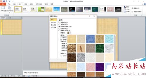 2、點(diǎn)擊設(shè)置,設(shè)置背景格式,圖片或紋理填充,選擇紋理(選擇一個(gè)木紋紋理)