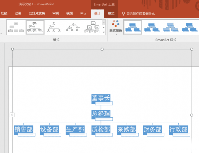如果對所生成的組織架構圖不滿意,可以切換到“SmarArt-設計”選項卡中,在版式中換一種樣式