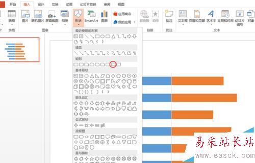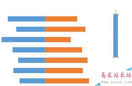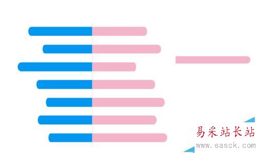 先插入一個“同側圓角矩形”,設置形狀顏色為藍色,邊框為透明,按住shift向左旋轉90°。Ctrl+C這個矩形,再選中男性那一欄的圖表,Ctrl+V,即得到下圖效果(教程參考下文)。女性那一欄同樣的方法,更改顏色,旋轉180°后再復制粘貼。