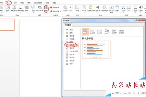 1、插入條形圖。新建一個PPT文檔,插入空白頁,菜單欄中“插入”“圖表”“條形圖”