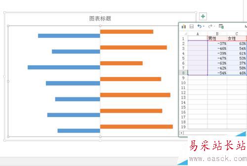 2、編輯數據。調出數據編輯表格,我們只需要留兩列,注意,這里要寫百分數,且男性那一列數字為負值。