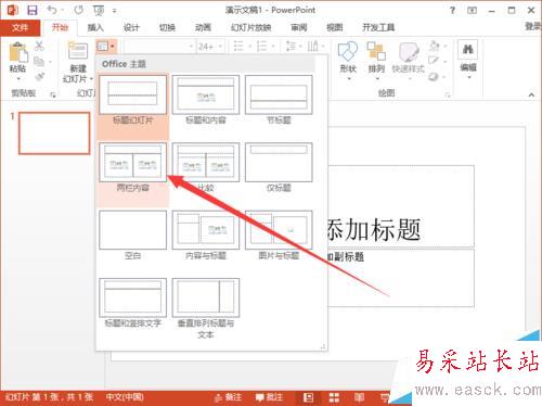 4、在彈出的幻燈片版式選項(xiàng)框中,選擇一個(gè)幻燈片樣式點(diǎn)擊它,如“兩欄內(nèi)容”。如圖所示;