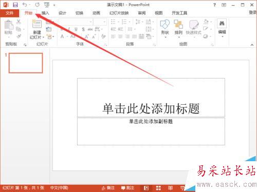 2、在打開的PowerPoint程序窗口中,打開“開始”菜單選項(xiàng)卡。如圖所示;