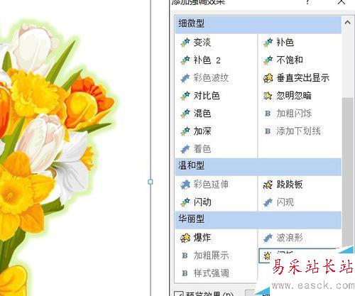 4、動(dòng)畫面板中,選擇添加效果——強(qiáng)調(diào)——閃爍。為圖片添加閃爍動(dòng)畫。