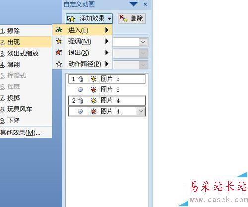 9、為復(fù)制的圖片添加進(jìn)入效果,選擇“出現(xiàn)”即可。