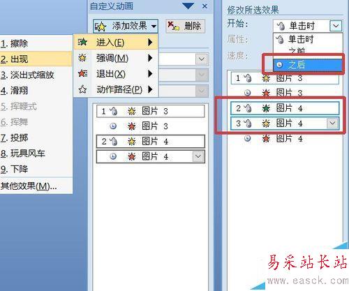 10、將進(jìn)入效果拖至第二張圖片動(dòng)畫效果的最上方。并將“出現(xiàn)”與“閃爍”效果的開始欄都改為“之后”。