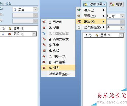 6、點(diǎn)擊圖片,添加效果——退出——消失,開始項(xiàng)選擇“之后”。