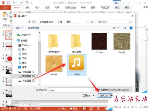 5、在“插入圖片”對話框中,找到存放圖片的文件夾,并選中需要插入的圖片文件,再點擊“插入”按鈕。如圖所示;