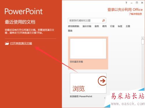 1、在電腦桌面的PowerPoint2013演示文稿程序圖標上雙擊鼠標左鍵,將其打開運行。點擊“打開其他演示文稿”,打開需要編輯或者要進行修改的PPT幻燈片文件。如圖所示;