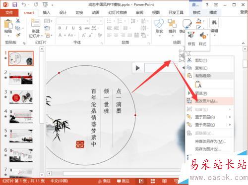 2、在打開的PowerPoint程序窗口中,選中音頻文件圖標,點擊鼠標右鍵,在彈出的選項框中選擇“更改圖片”選項并點擊它。如圖所示;
