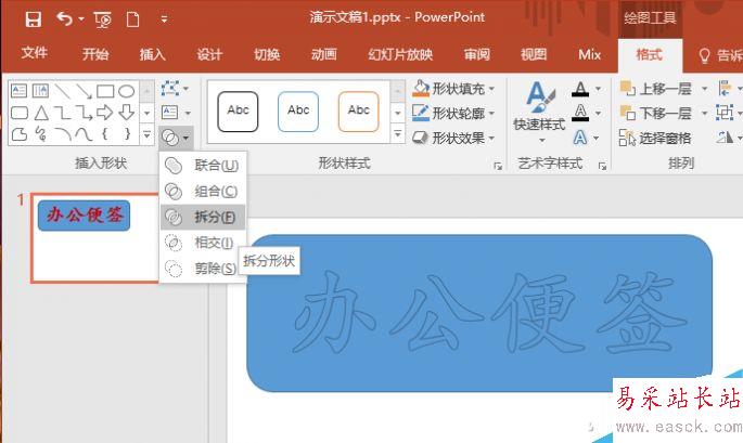 接下來切換到“繪圖工具-格式”選項卡,點擊打開“合并形狀”子菜單,選擇其中的“拆分”。