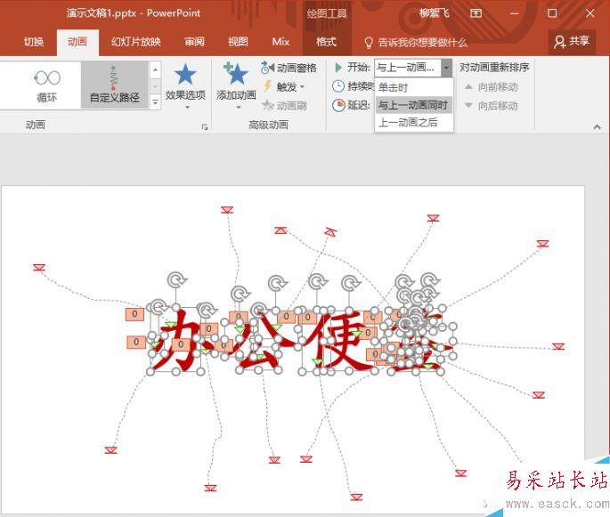 此時按F5鍵預(yù)覽動畫效果,會發(fā)現(xiàn)必須點擊(或按空格鍵)一次才會飛出一個筆畫,這跟爆炸效果有點不符。很好解決,首先按Ctrl+A鍵全選所有筆畫,然后在上面工具欄中,將“開始”設(shè)置為“與上一動畫同時”,此時再按F5鍵播放,就會是本文開始動圖中的效果了。