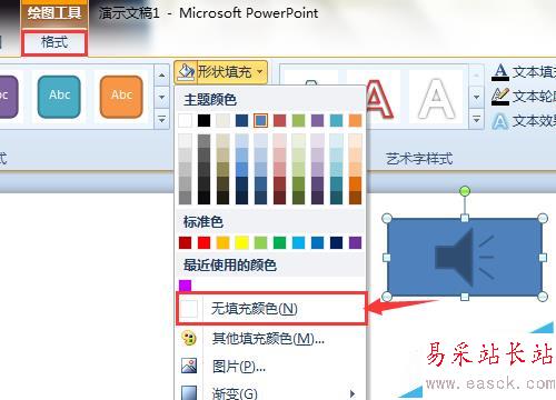小編這里以“聲音”按鈕形狀來演示操作,插入形狀之后會有顏色,我們可以先點形狀填充里面的【無填充顏色】去掉填充顏色,再點形狀輪廓為圖案加上喜歡的外輪廓顏色。點一下圖案就會打開“繪圖工具”的菜單了,也能進行其他喜歡或與內容合適的設置,個人要求吧。
